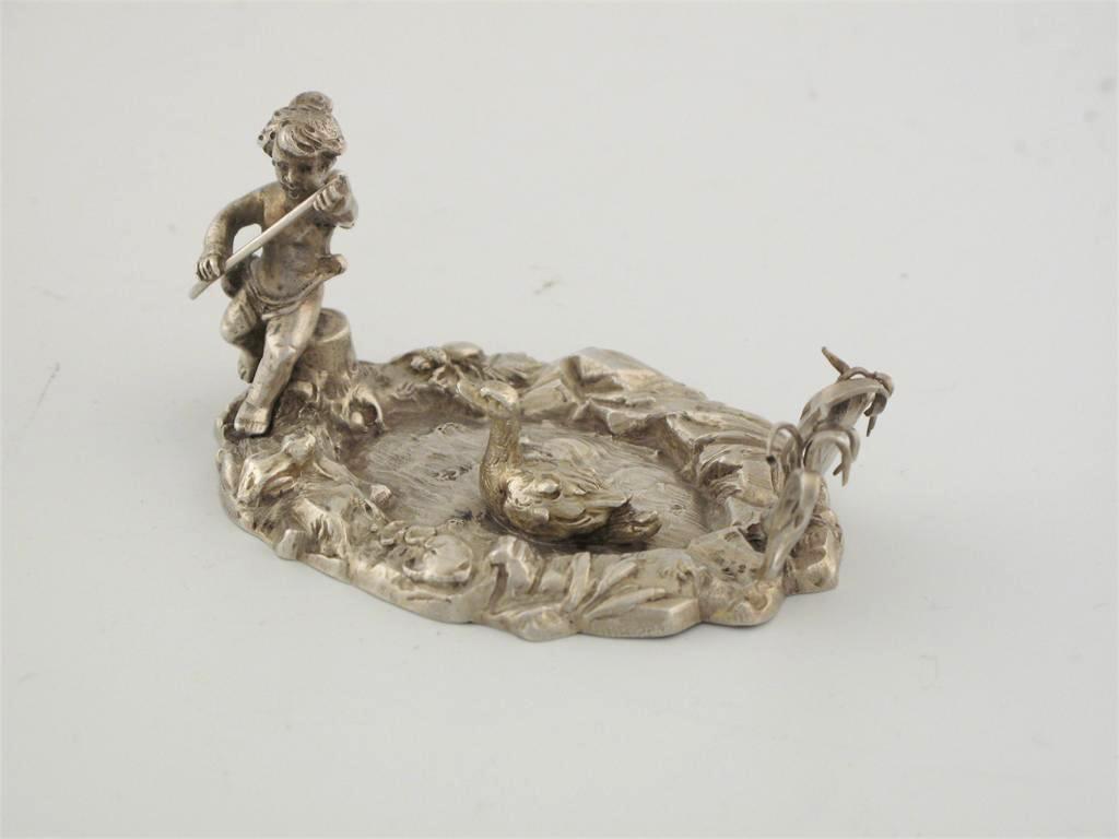 A German late 19th example, a putti seated on a tree stump beside a pond with a duck and fish in the water, 3.5in (8cm) long.