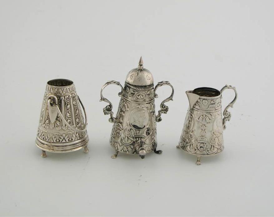 A conical tea urn, embossed with swags and circular framed portraits, pull of cover, on three feet, matching jug together with an embossed conical vessel with scroll handles. (3)