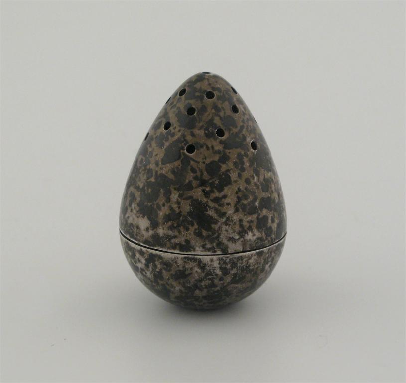 A Victorian novelty pepper in the form of a bird's egg with cold-painted detail, screw cover, by Sampson Mordon, London 1882, 1.8in (4.5cm) high, 0.75oz.