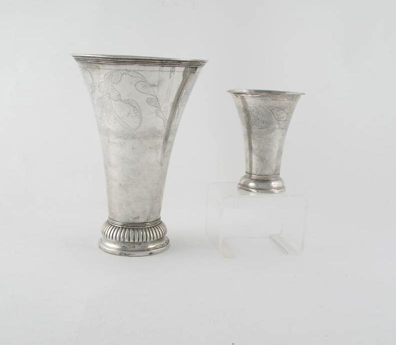 Two flared Swedish beakers: a large example on a ribbed foot with wrigglework engraving, maker's mark "NL", Lulea 1819 and a small example 1831, the large beaker 7.7in (19.5cm) high, 10oz. (2)