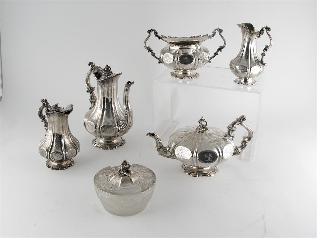 A Victorian six piece tea and coffee service, shaped circular bodies with flat oval panels around the sides and delicate, floral engraving, crested, comprising: coffee pot, teapot, sugar bowl, milk jug, hot milk jug and a mounted glass butter dish, by J.C. Edington, London 1845/46/47, 94oz weighable silver.