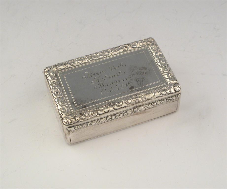 A Victorian oblong snuff box with engine turned decoration and raised borders of chased flower heads around the cover, inscribed 'Thomas Collis, Postmaster, Bromsgrove 1840', gilt interior, by Thomas Edwards, London 1840, 4in (10cm) long, 8.25oz.