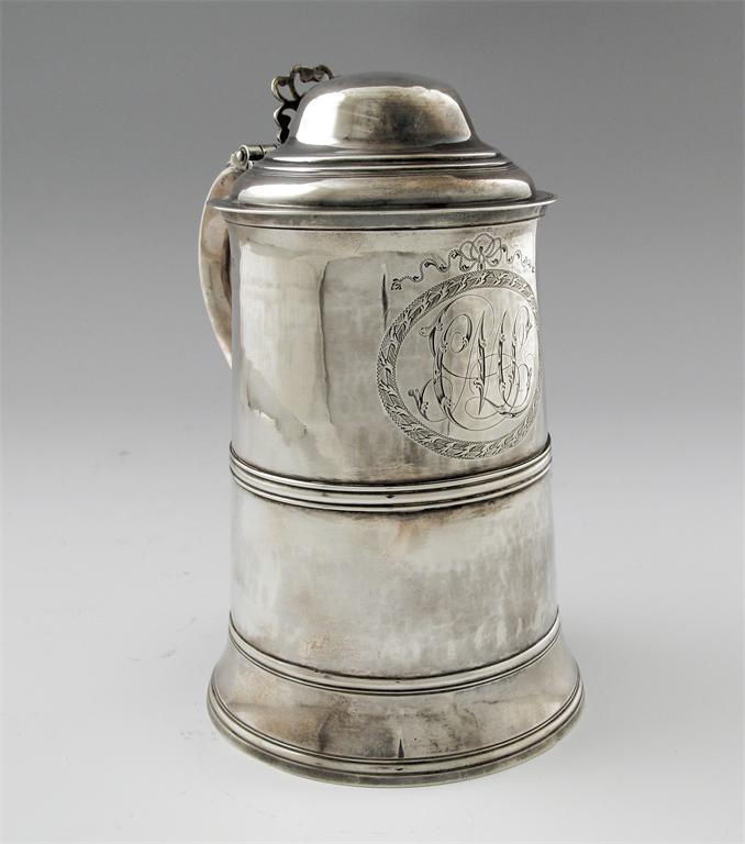 A George III tapering tankard, with a flared base, moulded girdle and a large scroll handle, the domed cover with a pierced scroll thumbpiece, initialled "CML" within a bright engraved oval cartouche, by Peter & William Bateman, London 1808, 8.25in (21cm) high, 26oz.