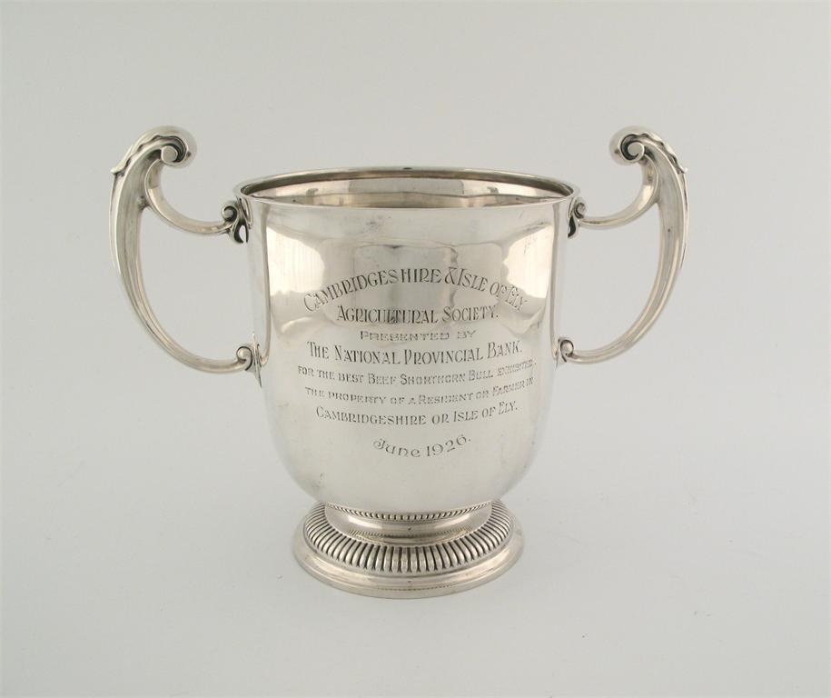A modern two handled trophy cup, with ribbed foot, inscribed 'CAMBRIDGES HIRE & ISLE OF ELY AGRICULTURAL SOCIETY...June 1926', by Mappin & Webb Ltd., Sheffield 1924, 8.7in (22cm) high, 37 oz.