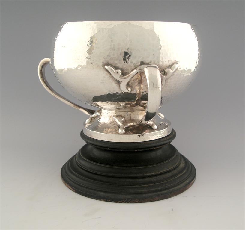 An Edwardian Art Nouveau, globular rose bowl with a hammered finish and three bifurcated scroll handles, by Barker Brothers, Birmingham 1905, (with wooden plinth), 8.6in (22cm) diameter, 50.5oz.