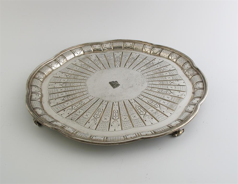 A Victorian salver, with a wavy border, central cartouch and a border of segmented geometric engraving, on four scroll feet, by John Samuel Hunt, Retailers stamp for "Hunt & Roskill late Storr & Mortimer", London, 1859, 13.8in (37.4cm) wide, 35oz.