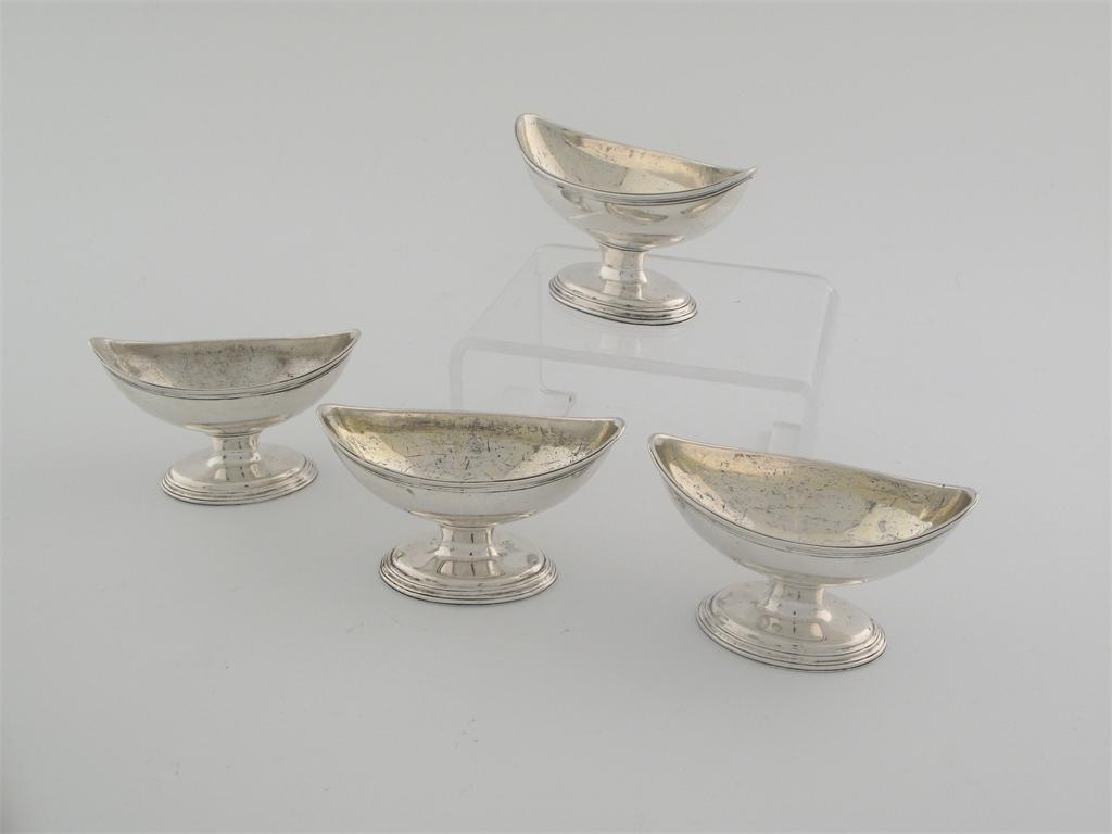 A set of four George III navette-shaped salts with reeded borders and pedastal bases