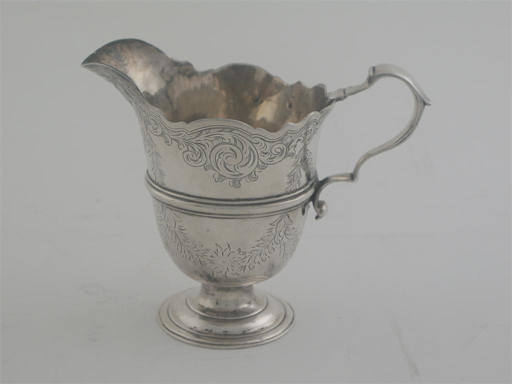 A George II/III Irish helmet cream jug, on a turned pedestal foot, with a scroll handle, moulded girdle and engraved decoration, the foot scratched underneath with the initials "R" over "SE" maker's mark lost in decoration, Dublin c.1760, 3.75in (9.5cm) high, 4oz.