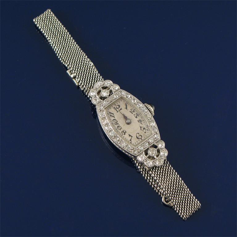 An Art Deco Lady's diamond set cocktail watch, the rectangular silvered dial with Arabic numerals, the jewelled Swiss movement in a platinum case with a diamond set bezel and black onyx winder, white gold mesh strap.