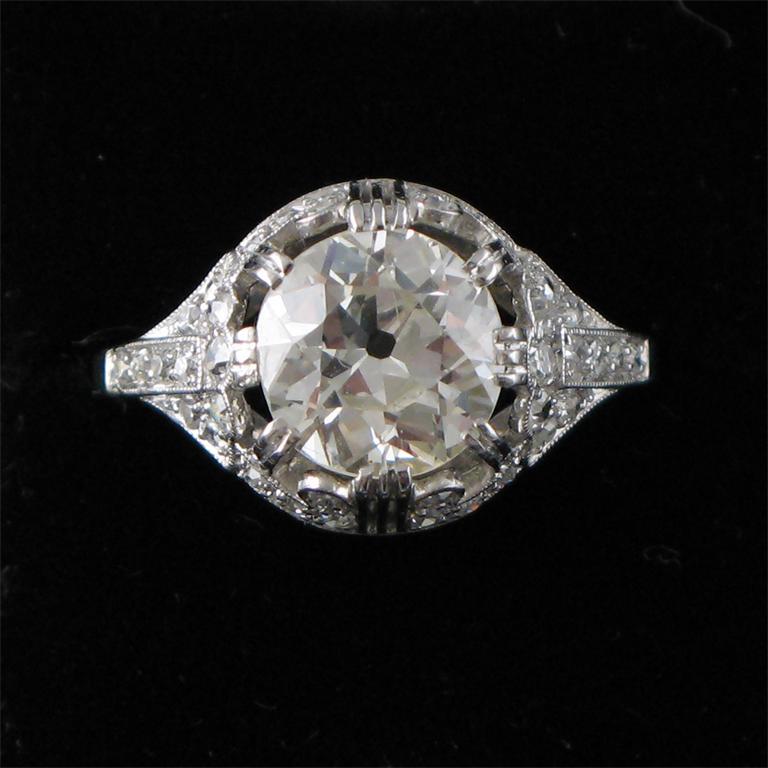 A diamond solitare ring, the transitional cut stone estimated to weigh approximately 1.75 carats, in a diamond set mount.