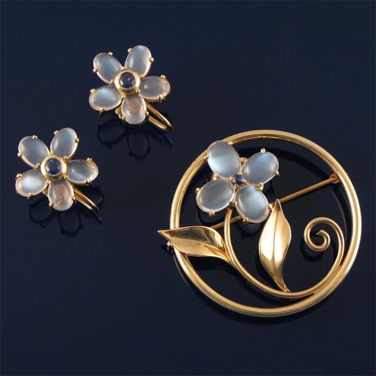 A circular gold brooch, with a moonstone and sapphire set flower and a pair of gold flower head earrings similarly set. Stamped 14K. 39mm maximum.