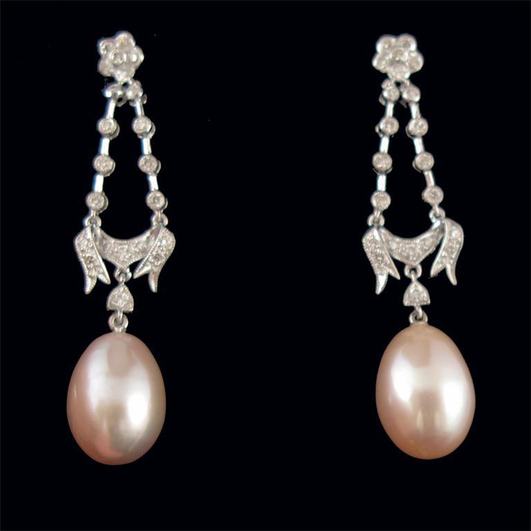 A pair of diamond and cultured pearl drop earrings, the festoon earrings set with small diamonds in 18ct white gold.