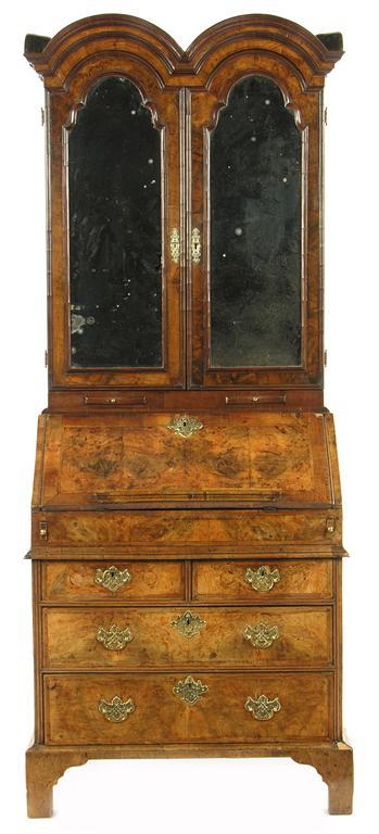 A walnut double domed bureau cabinet, the moulded cornice above a pair of mirrored doors enclosing adjustable shelves, pigeon holes and four drawers, to a pair of candle slides above a fall flap enclosing a stepped interior, pigeon holes, drawers and a well, the girdle moulding above two short and two long drawers, fitted replaced handles on bracket feet, the bureau 18th century the cabinet later, 78.75in (200cm) h, 31.5in (80cm) w, 18.5in (47.3cm) d. Losses and replacements to veneer, the fall warped.