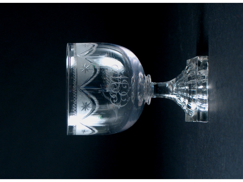A wine glass, the bowl engraved with drapes and a monogram, raised on a lemon squeezer base, early 19th century, 12.5cm.