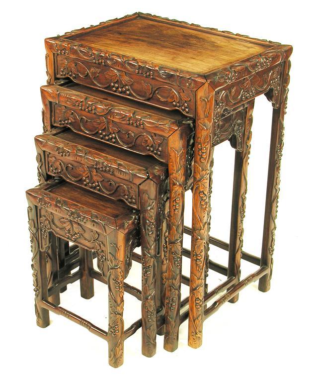 A Chinese carved hardwood quartetto nest of tables, the rectangular panelled tops to fruiting vine decoration, the largest table, 28in (71cm) h, 19.75in (50cm) w, 14.25in (36cm) d. (4)