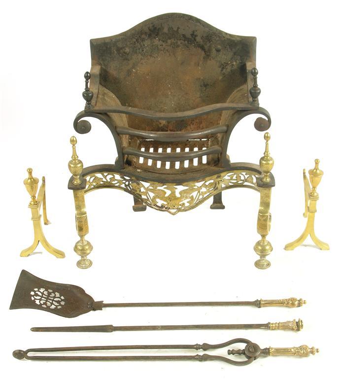 An 18th century style cast iron and brass firegrate, of serpentine form the pierced apron engraved an eagle and foliage, on scroll supports, 20.25in (51.2cm) w, three gilt brass and steel fire irons and a pair of brass andirons. (6)