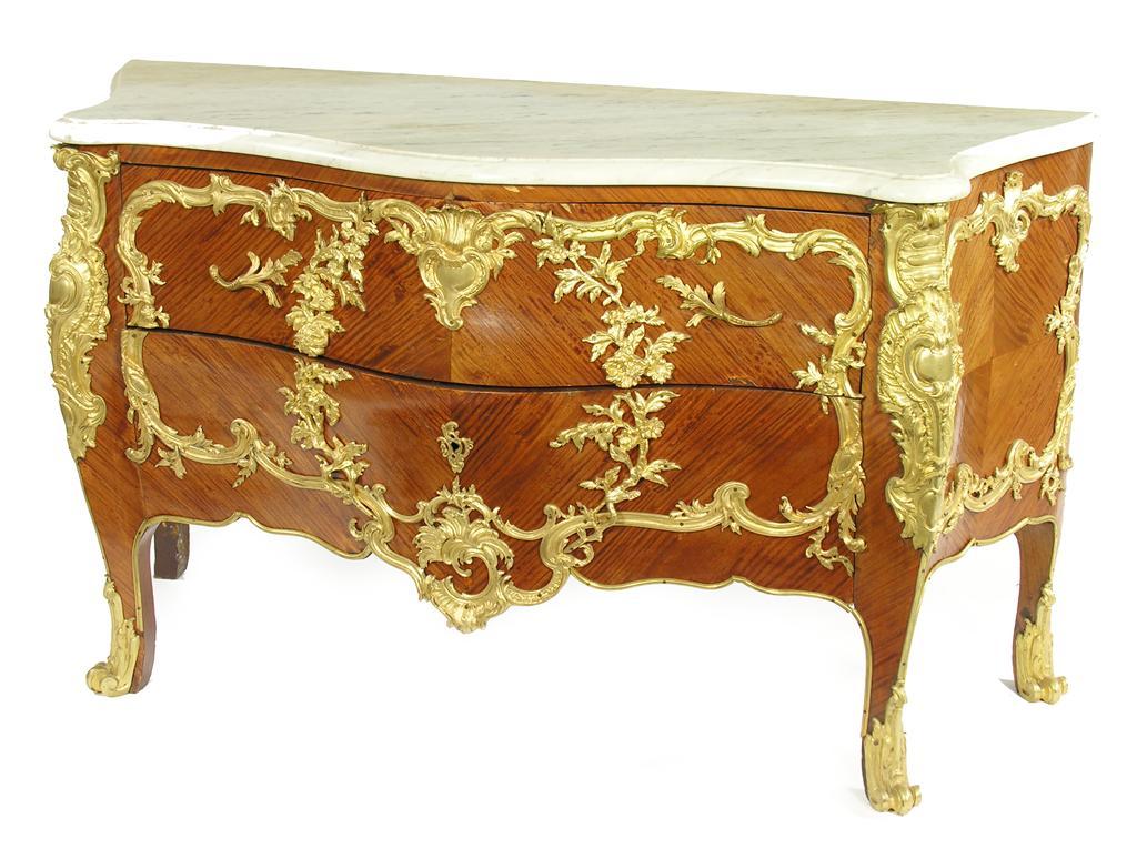 A 19th century French kingwood and ormolu mounted serpentine commode, the Carrara marble moulded edge top above two long drawers, the mounts in rococo style with flowers and foliage, the conforming sides to scroll feet, 35.75in (90.6cm) h, 62in (157.5cm) w, 23.5in (59.6cm) d. One mount off but present.