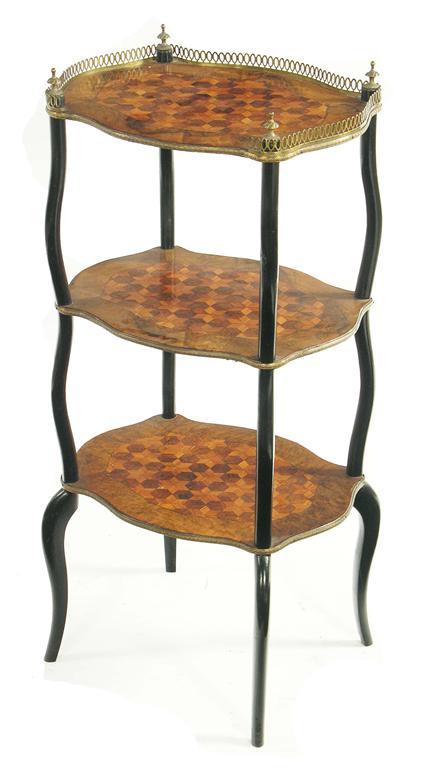 A late 19th century French walnut and parquetry three tier etagere, with gilt metal mounts and ebonised supports, 32.75in (83cm) h, 15.5in (39cm) w, 11.5in (29.8cm) d.