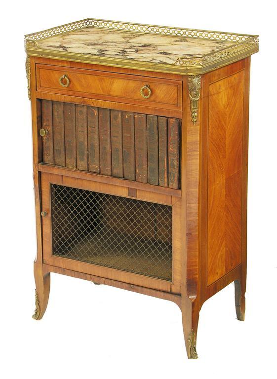 A late 19th century French kingwood table en chiffonniere, with gilt metal mounts, the Breche Medoux marble top with a 3/4 gallery above a frieze drawer and two cupboard doors one with a faux book front, 29.5in (74.8cm) h, 19.5in (49.6cm) w, 12in (30.5cm) d. Interior shelf missing.