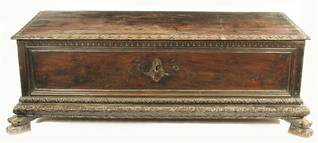 A 19th century Italian carved walnut casonne, the hinged pine top with later hinges, to panelled front and sides, with a carved ovolo and husk base, on paw feet, 23.25in (59cm) h, 71in (180.5cm) w, 31in (78.5cm) d.