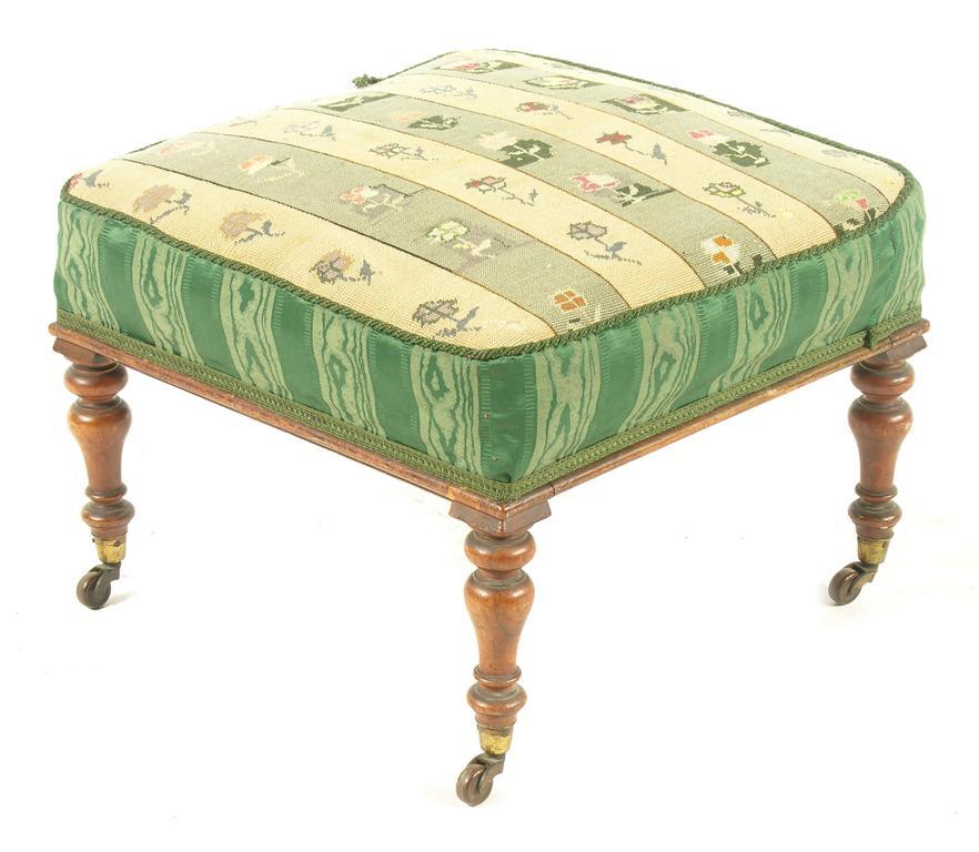 A Victorian stool, the floral needlework upholstered top on turned walnut legs, with ceramic castors, 16in (40.5cm) h, 21.75in (55cm) w.