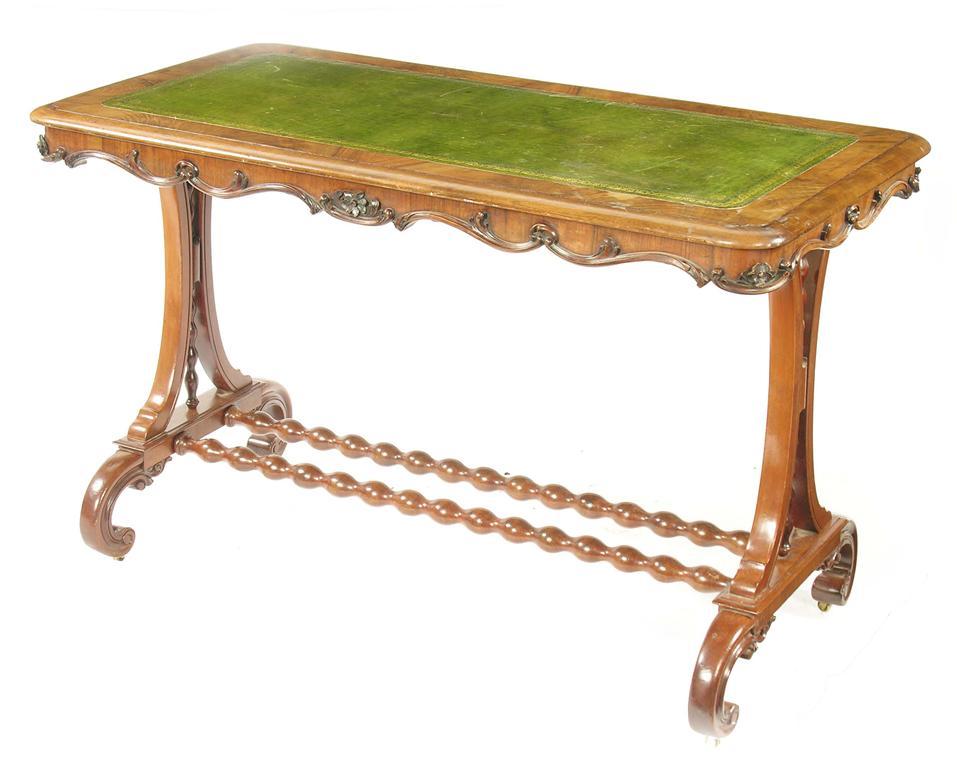 A Victorian walnut writing table, the crossbanded top inset green gilt tooled leather above a carved frieze on stretchered scroll supports on brass castors, 28in (71cm) h, 44.75in (113.6cm) w, 22.5in (57cm) d. Restorations, three castors replaced.