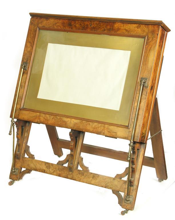 A Victorian burr walnut folio stand, the hinged moulded edge top above a glazed fall with brass supports, above an easel type base with pierced brackets, on ceramic castors, 43.25in (109.4cm) w, 36.5in (92.7cm) w. One brass support off but present.
