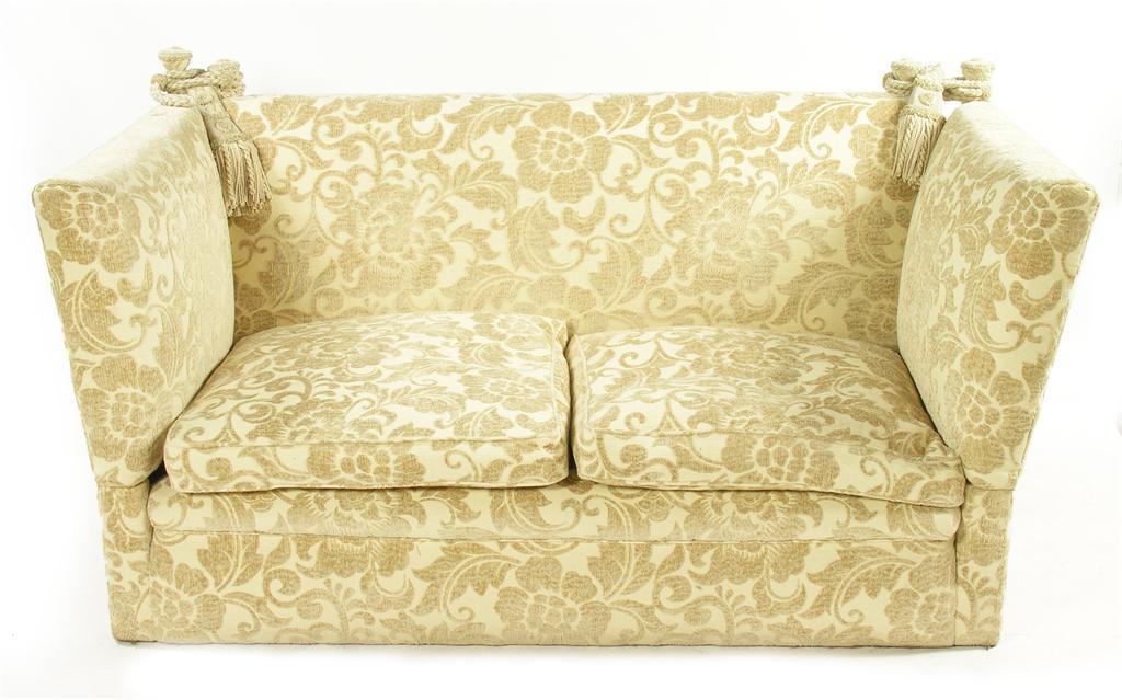 A two seater knole settee, upholstered in fawn floral damask, 36in (91.5cm) h, 69in (175cm) w, 34.5in (87.5cm) d.