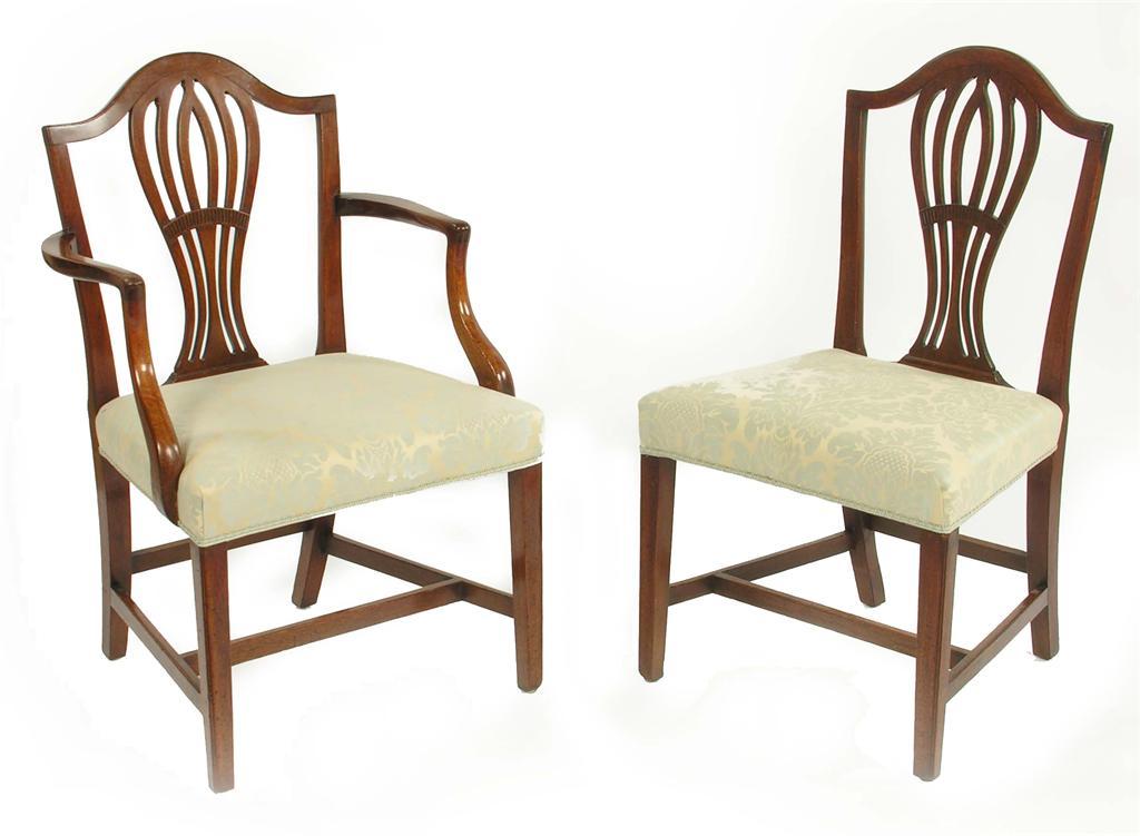 A set of eight George III mahogany dining chairs, the shaped top rail above a pierced splat, the damask upholstered stuffed over seats, on channelled square tapering legs united by 'H' stretchers, comprising: a pair of armchairs and six side. (8) One of the carvers probably later.