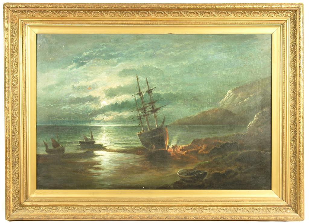 A late 19th century oil on canvas moonlit beach scene, 20 x 30in (51 x 76cm).