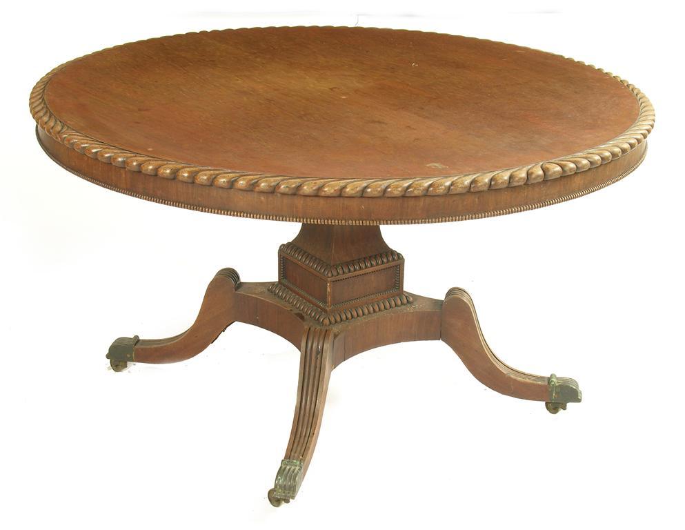 A George IV mahogany centre table, the 'plum pudding' circular top with a gadrooned edge above a nulled frieze, the stepped stem on a quatreform base and hipped reeded downswept legs, conforming brass sabots and castors, 28.25in (71.9cm) h, 51.25in (130.3cm) dia. Later block, some losses to mouldings.