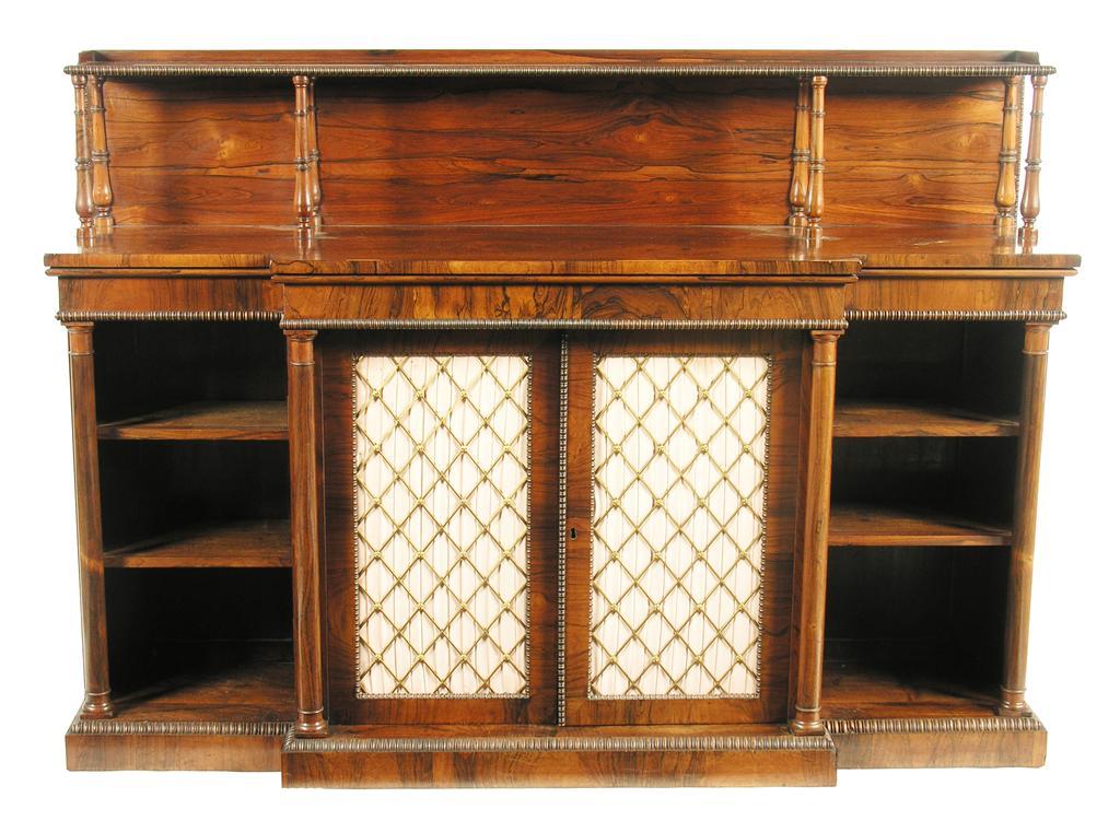 A Regency rosewood breakfront chiffonier, with nulled edges, the 3/4 galleried top supported by ring and baluster turned columns, above a pair of pleated fabric and brass grille doors enclosing shelves, flanked by open shelves, and turned columns, on a plinth base, 49in (124.6cm) h, 67in (170cm) w, 17.5in (44.4cm) d.