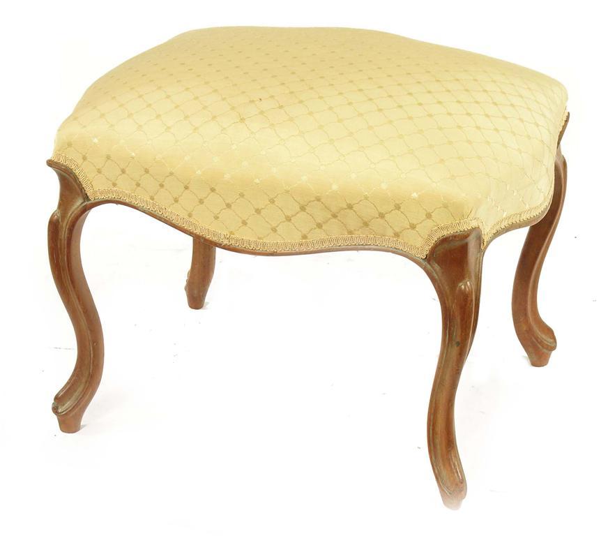 A Victorian walnut stool, of serpentine outline, the upholstered top on moulded cabriole legs, 20.5in (52cm) h, 27in (68.5cm) w, 21.5in (54.3cm) d.