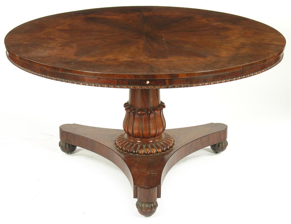 A George IV rosewood centre table, the circular tilt-top with a figured radiating veneer above a reel and dart applied moulded frieze on a turned stem with leaf carved bowl and ribbed edge the triform base with part ribbed turned feet the brass castors stamped 'C. Cope Patent,' 28in (71cm) h, 52in (132cm) dia.