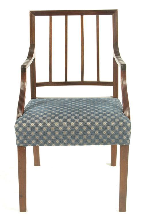 An early 19th century mahogany open armchair, the reeded slatted back to downswept arms, on chamfered square tapering supports.