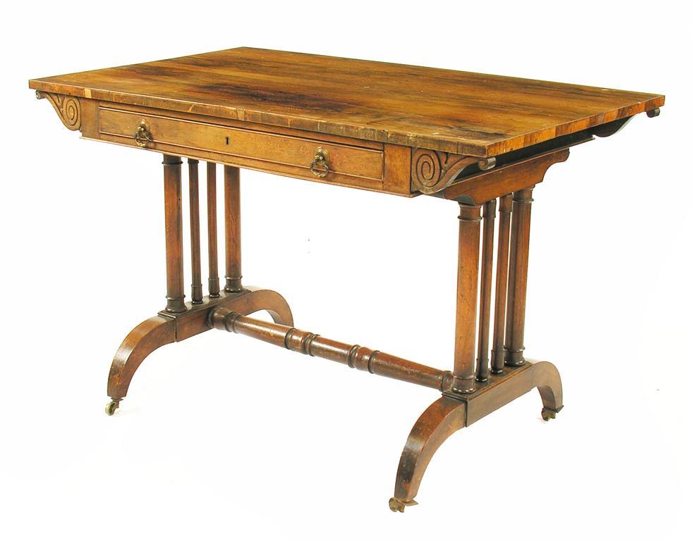A George IV rosewood sofa table, the reduced rectangular top above a frieze drawer flanked by scroll volutes on turned end supports united by a turned stretcher on scroll legs to brass castors, 28.25in (72cm) h, 44in (112cm) w, 26.75in (68cm) d.