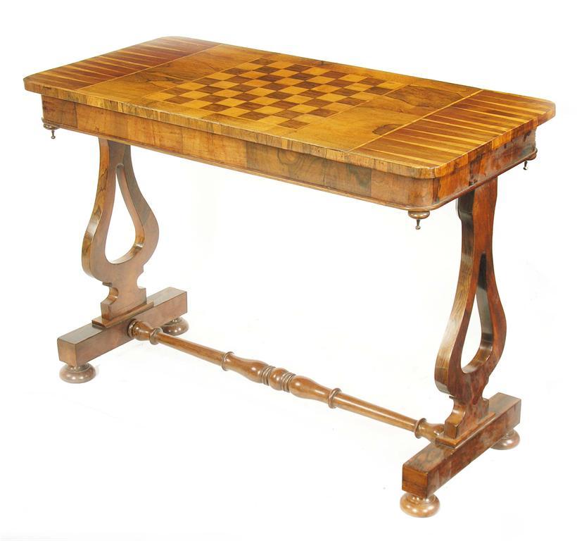 A Victorian rosewood games table, the rectangular top inlaid a chequer and backgammon boards, on pierced vase shape trestle ends united by a turned stretcher on flattened bun feet, 27.25in (69.2cm) h, 38.5in (97.6cm) w, 18.75in (47.6cm) d.