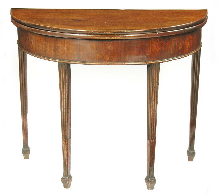 A George III mahogany demi-lune tea table, the hinged top above a plain frieze on square tapering stop fluted legs to spade feet, 28.75in (72.7cm) h, 35.25in (89.5cm) w, 17.25in (43.6cm). Support mechanism now fixed, old worm holes.