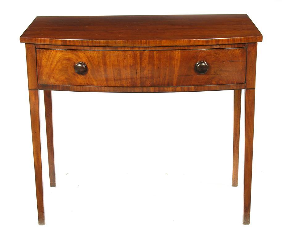 An early 19th century mahogany bowfront side table, the frieze drawer with ebonised stringing, 31.25in (79cm) h, 36in (91.5cm) w, 20in (51cm) d.
