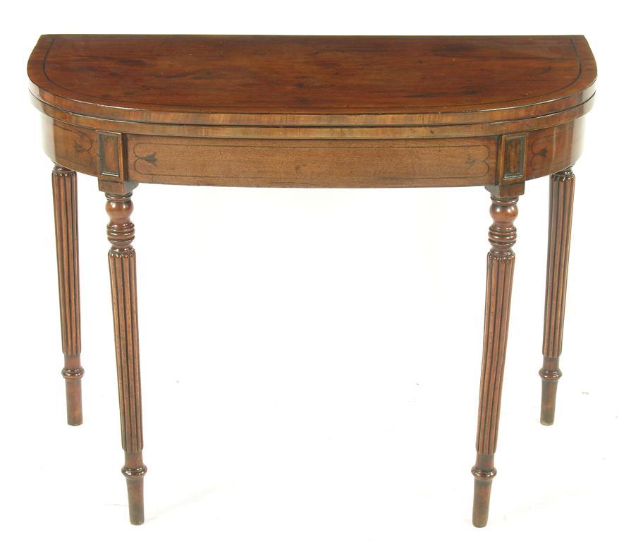 A mahogany tea table, with inlaid ebonised stringing and bell flower decoration, the 'D' shape hinged top above four turned and reeded legs, 28in (71.3cm) h, 35.75in (90.8cm) w, 17.25in (45cm) d. Predominately early 19th century with restorations, back left leg replaced.