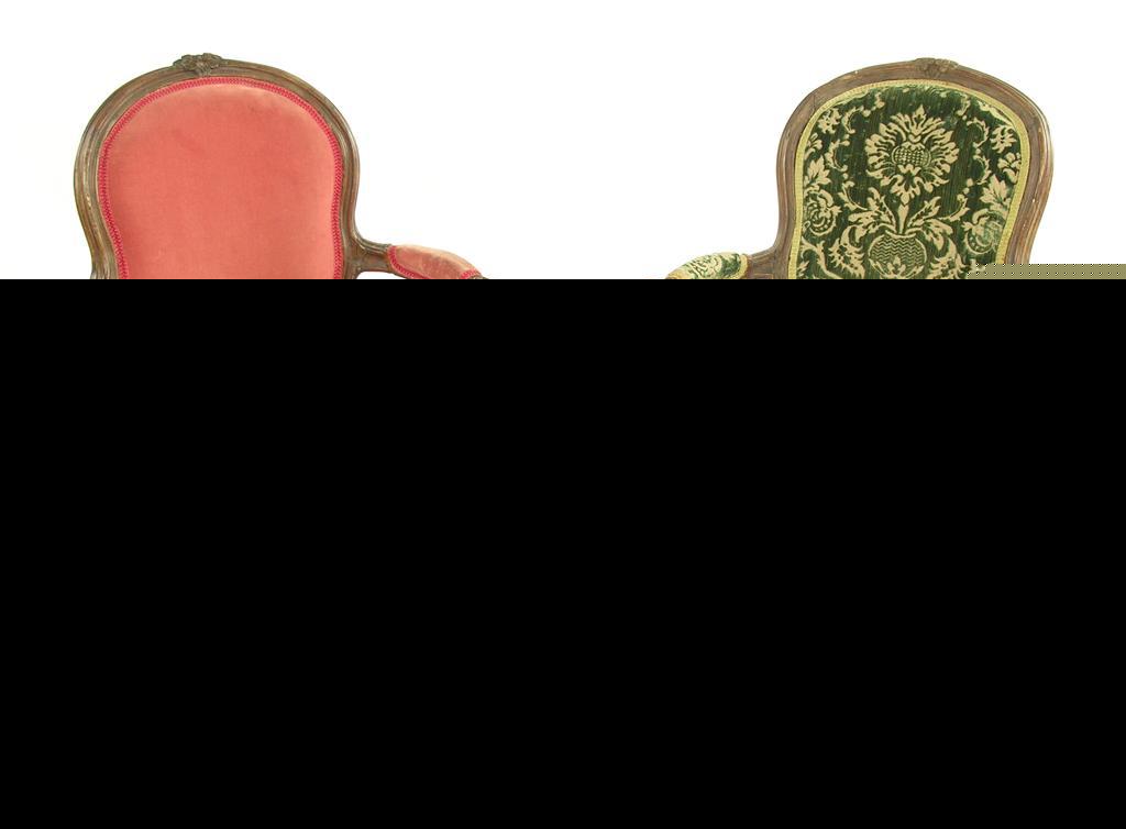 A near pair of Louis XVI provincial beechwood fauteuil, with carved and moulded frames, the cartouche backs above serpentine front seats on front cabriole legs, each with differing upholstery. (2) Old worm, minor damages.