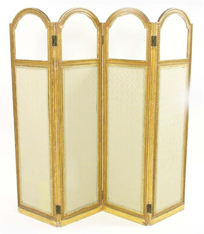 A gilt and gesso four fold commode screen, the arched tops with glass panels, the frame with leaf and dart and beaded decoration, 55.5in (141cm) h, 15.25in (38.5cm) w, (each panel).