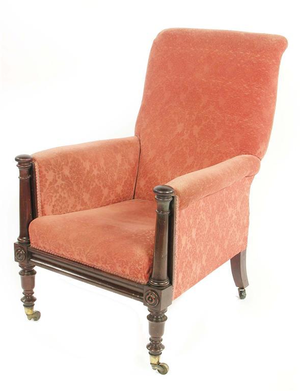 An early Victorian mahogany armchair, the upholstered back, arms and seat, to turned columns and rondel headed turned tapering front legs and brass caps and castors. Rear castors replaced.