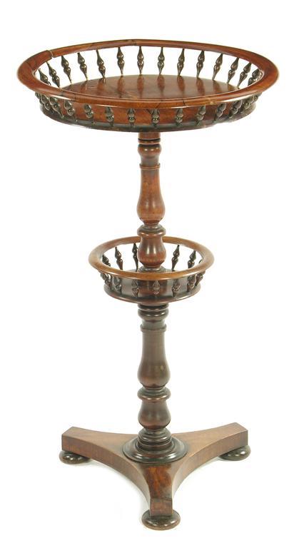 An early Victorian rosewood two tier sewing table, each tier with a spindle gallery on a turned baluster stem, triform base and disc feet, remains of paper label 'Brown & Sons' to underside, 30.5in (77.8cm) h, 17.75in (45cm) dia. Damage to top gallery.