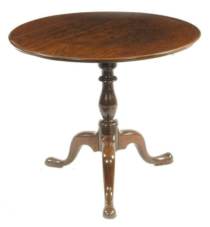 An 18th century mahogany tripod table, the associated circular dished top on a baluster turned stem, cabriole legs and pad feet, 27.5in (70cm) h, 32.25in (82.2cm) dia. Cracks to top, old damages and repairs to base.