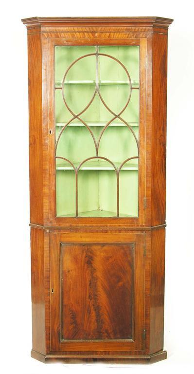 A mahogany standing corner cupboard, the cavetto cornice above an astragal glazed door enclosing three shelves, the base with a panelled door enclosing one shelf, on a plinth base, 79.25in (201.2cm) h, 32.25in (81.5cm) w. Minor losses and replacements to veneer.