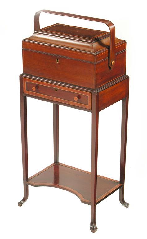 A late Victorian portable mahogany workbox on stand, with carrying handle, line inlaid and tulipwood banded, the hinged top revealing a lift-out tray, above a drawer on square tapering legs united by a shaped undertier, 29.5in (75cm) h, 15.25in 938.6cm) w, 10.25in (26cm) d.