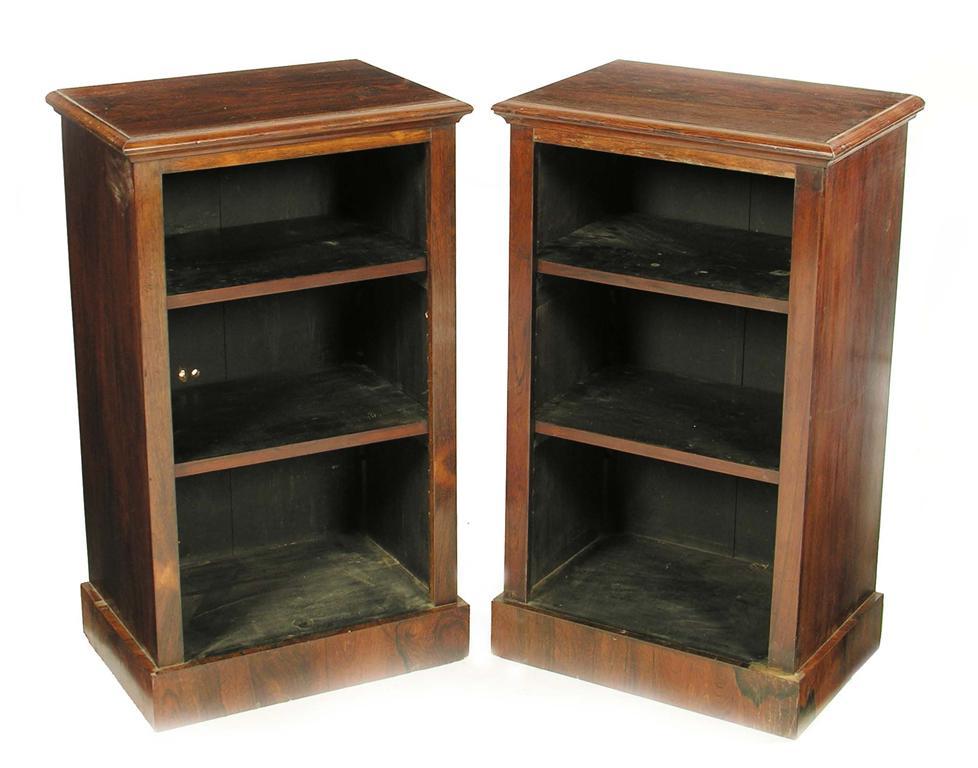 A pair of Victorian rosewood low bookcases, each with a moulded edge top and two adjustable shelves on a plinth base, 31in (78.5cm) h, 18.5in (46.8cm) w, 13in (33cm) d. (3) Some minor veneer loss.