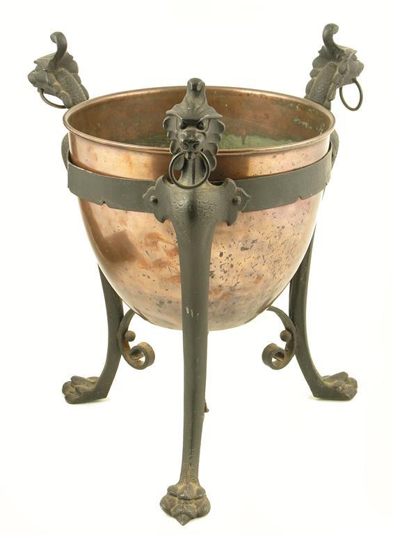 A copper and cast iron jardiniere, the lift-out liner supported by three lion's head monopodia, 50in (19.75in) h, 16.5in (42cm) w.
