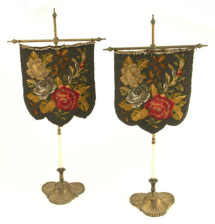 A pair of Victorian gilt brass and bead work table banners, 19in (48cm) h. (2)